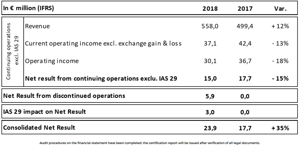 As a result, net income from continuing operations fell by -15%. Consolidated net income amounted to €23.9 million, or 4.3% of revenue, up 35% compared to 2017, positively impacted by the sale of the Italian rental business.
