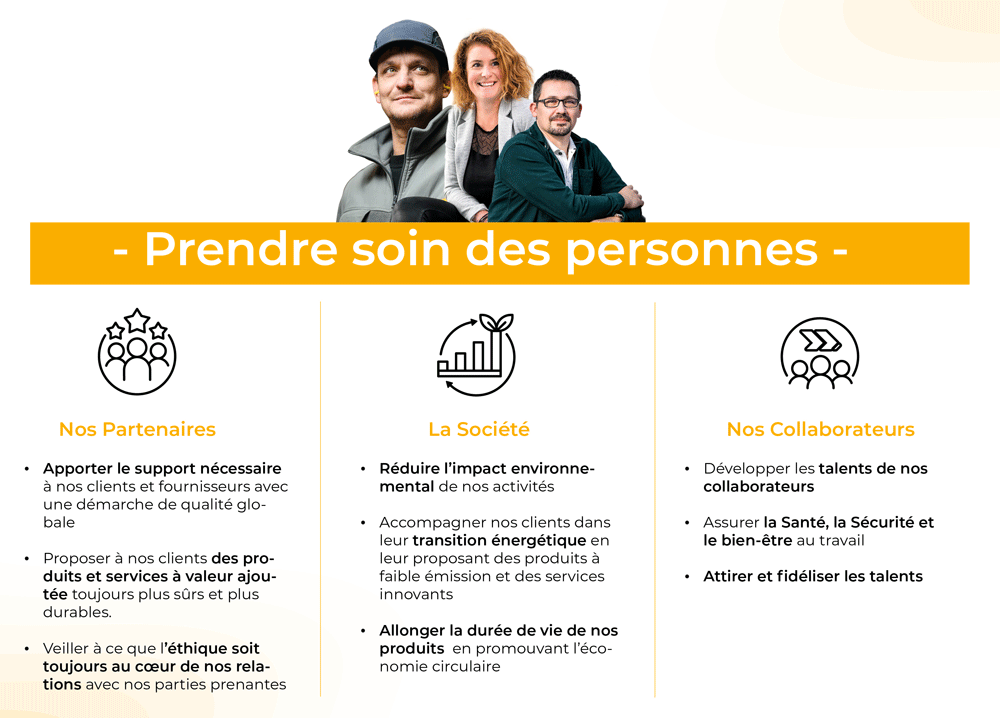 Au cœur de notre mission, notre engagement est de veiller à trois piliers fondamentaux qui définissent notre entreprise : prendre soin de nos salariés, de nos partenaires et de notre planète.